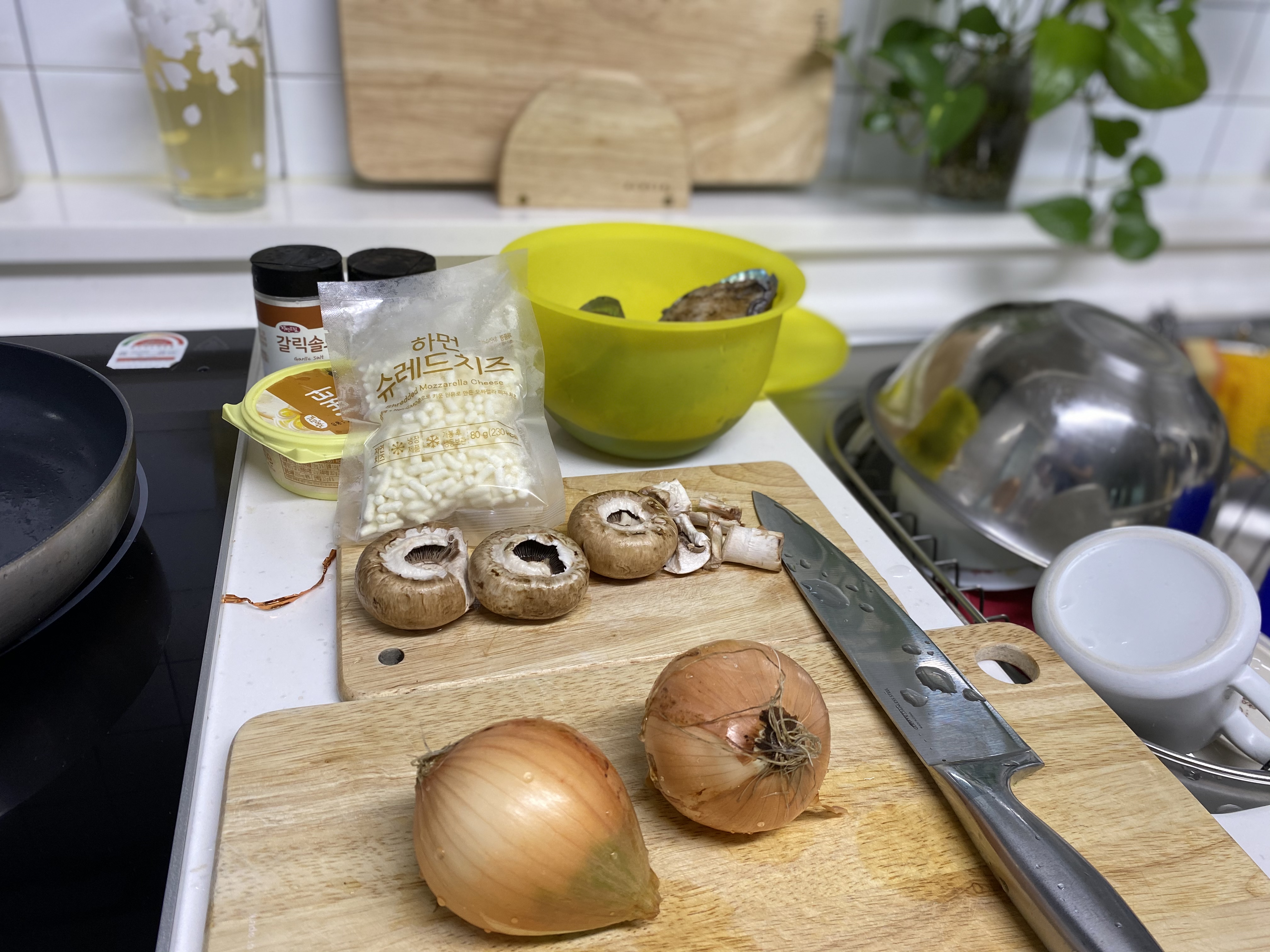 | 재료 : 전복 6미 (4인 가족 기준), 양송이 버섯, 양파, 대파, 버터, 모짜렐라 치즈, 후추, 소금 |
