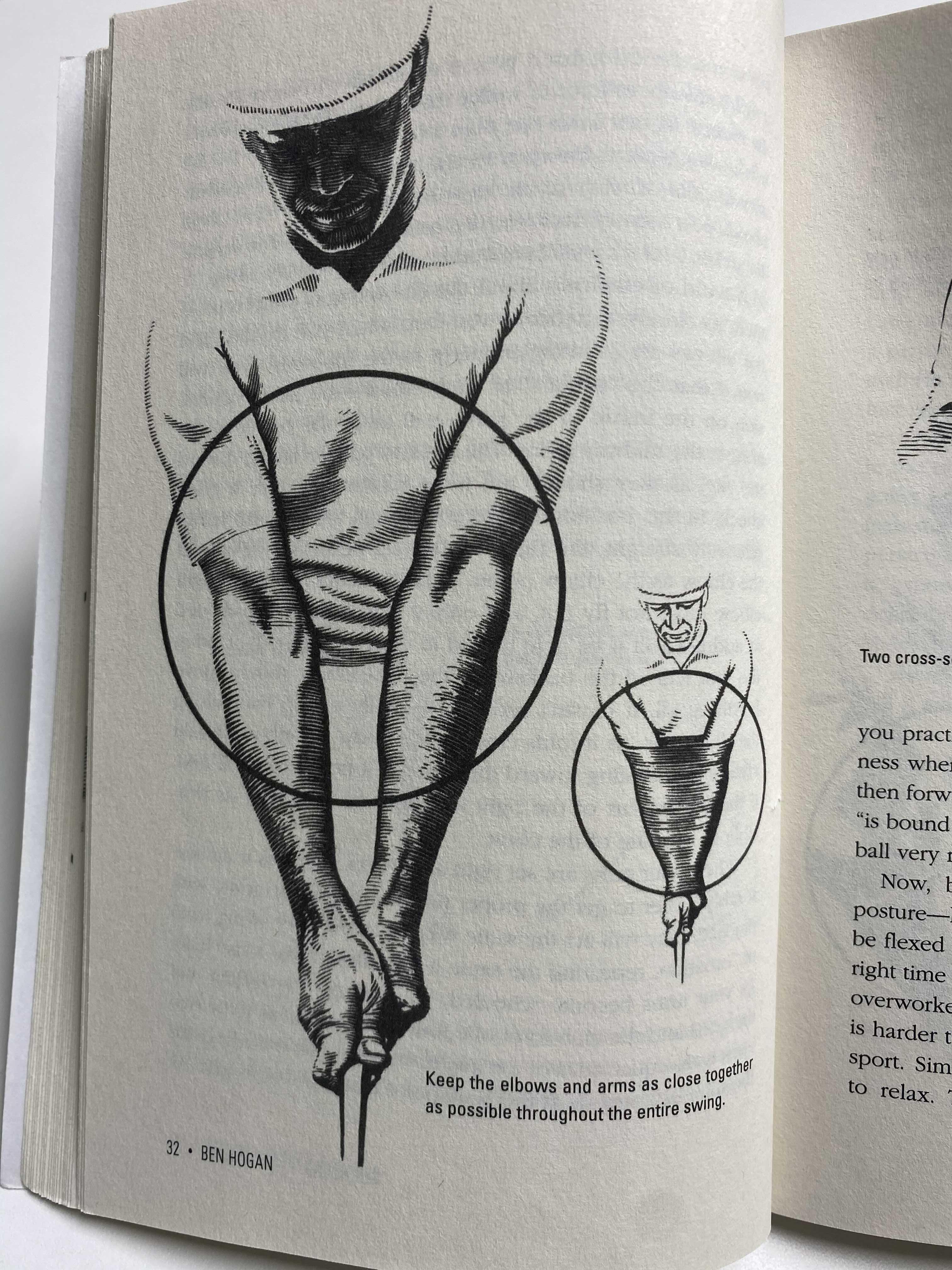 벤호건의 유명한 모던 골프의 기초편을 보면 어드레스 시에 팔을 마치 붕대로 감싼 듯한 그림이 나온다. 이때 영문 저서에서 'Two cross-sectional drawings showing relationship of the elbows to the hips.'이라는 그림 설명이 나오는데 팔꿈치와 엉덩이의 관계가 굉장히 중요함을 설명하고 있다. 이러한 팔꿈치와 엉덩이(골반)는 함께 움직이게 되면서 위치에너지가 0상태의 헤드를 위치에너지가 상당한 에너지로 변환하는 힘이 생기게 된다. 결국 손으로 들어버리면 이 에너지의 양이 매번 바뀌고 불안정해지므로, 안정된 에너지를 만들어내기 위하여 항상 비슷한 위치에너지를 생성할 수 있도록 해야한다. (결국 쉽게 말하면 높이를 일정하게 가져가야 한다는 점)