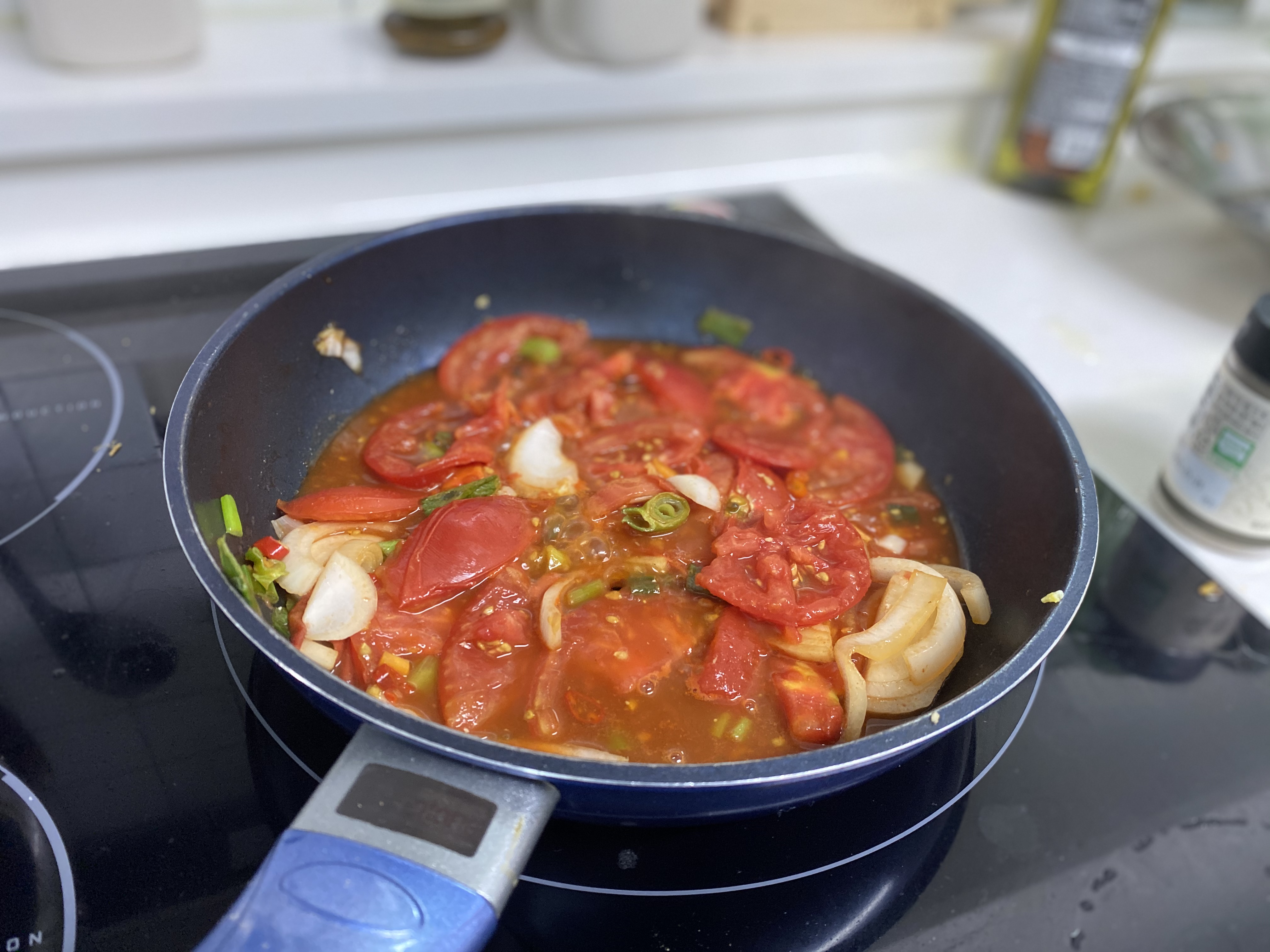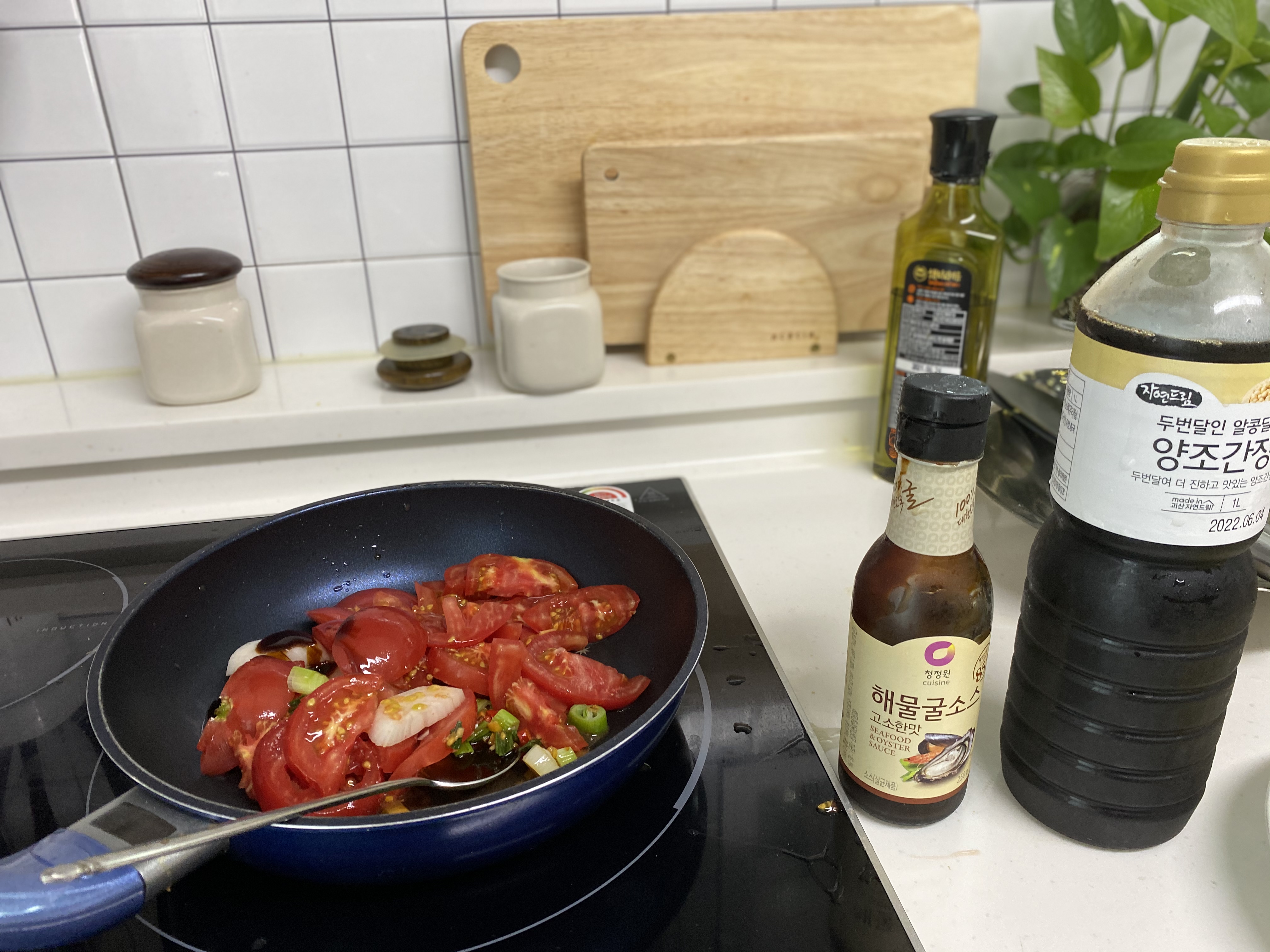 지금부터 인덕션에서 센 불로 가열해서 볶는 중이다. 토마토가 풀어지면서 어느정도 익으면 달걀 스크램블 투하. 함께 섞어준다. 굴소스 1큰술, 진간장 1큰술, 소금 약간, 후추를 뿌려준 후 좀더 익힌다.