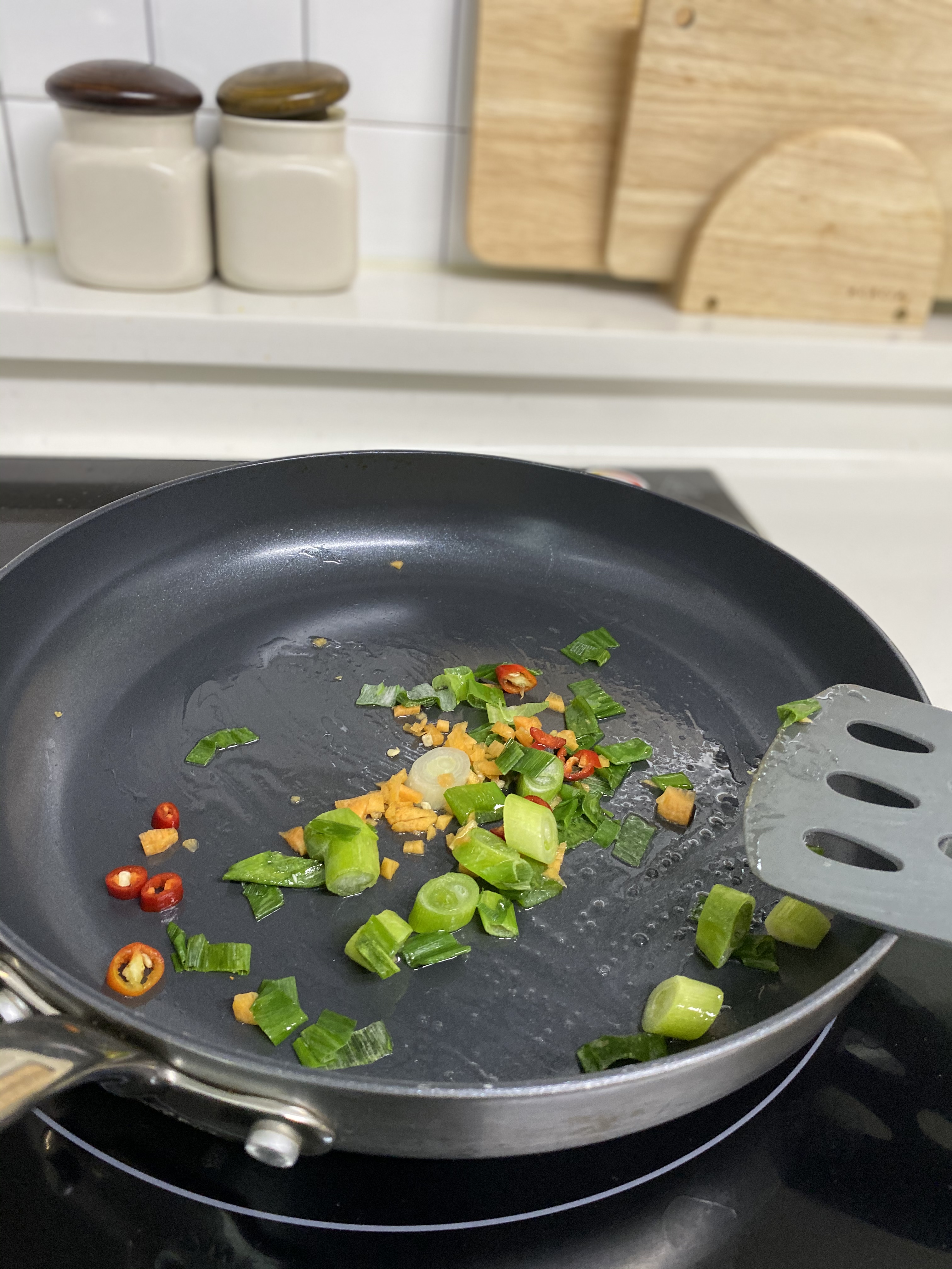먼저 미리 썰어 놓은 대파를 냉동실에서 꺼낸 후 파기름을 만든다. 이때 고추랑 당근을 살짝 볶으면서 양파도 넣어주면 향기도 좋고, 맛도 깊어진다.