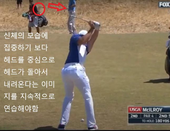 바디턴을 강조하고 상체 회전스윙을 하다보면 오른 어깨가 빨리 나오고, 오버더탑 현상이 나올 수 있는데 좀더 여유있게 헤드가 스윙플레인을 타고 돌아나올 수 있도록 몸의 움직임을 부드럽게 해야한다. 상체의 회전량을 중요시 하되 하체의 버팀과 부드럽게 돌아나오는 회전이 되어야 한다는 것이다.