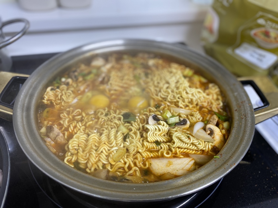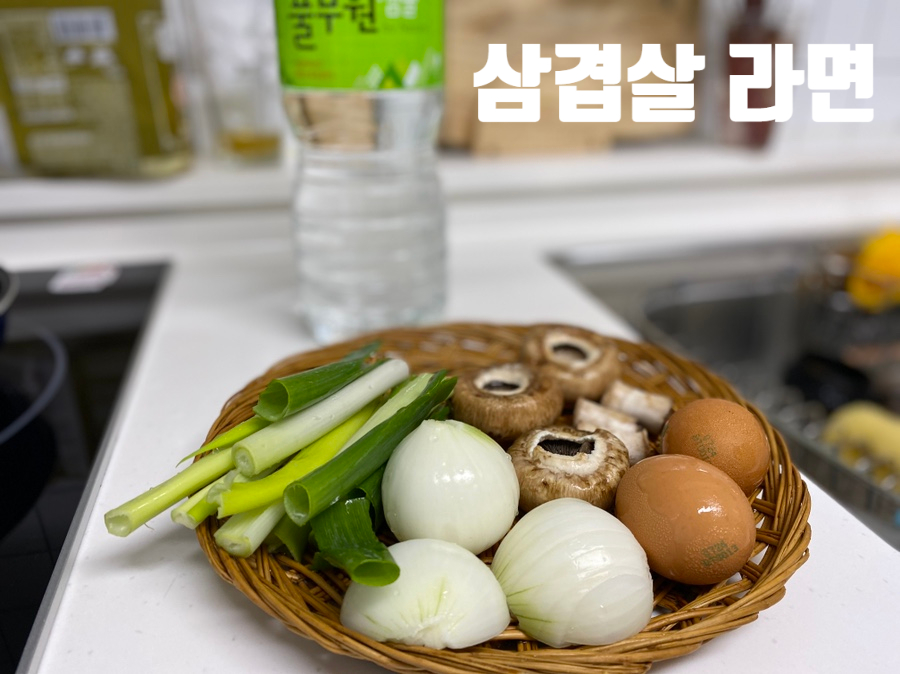 라면 4봉지, 삼겹살 1팩(4줄), 양송이 버섯, 양파, 대파, 달걀 2알, 후추, 소금