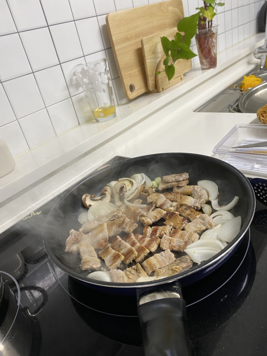 옆 후라이팬에서는 삼겹살이 잘 익고 있다. 양파랑 양송이 버섯을 함께 넣어 잘 익힌 후 바삭한 맛이 느껴질 수 있게 구웠다. 생삼겹을 구울 때 맛과 풍미를 높이기 위하여 후추 약간과 소금을 뿌려줬다.
