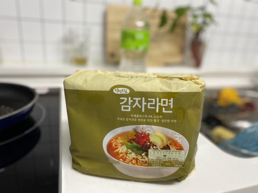 미세플라스틱이 들어있지 않은 라면으로 4봉 준비했다. 4명이 먹기에 많을 수도 있으므로 3봉지 절반을 넣었다. 스프는 그대로 4개 다 넣어 맛을 유지했다. 1줄은 잘라서 육수를 내는데 사용했고, 비계 부분으로 후라이팬 표면을 닦고 둘러줬다.