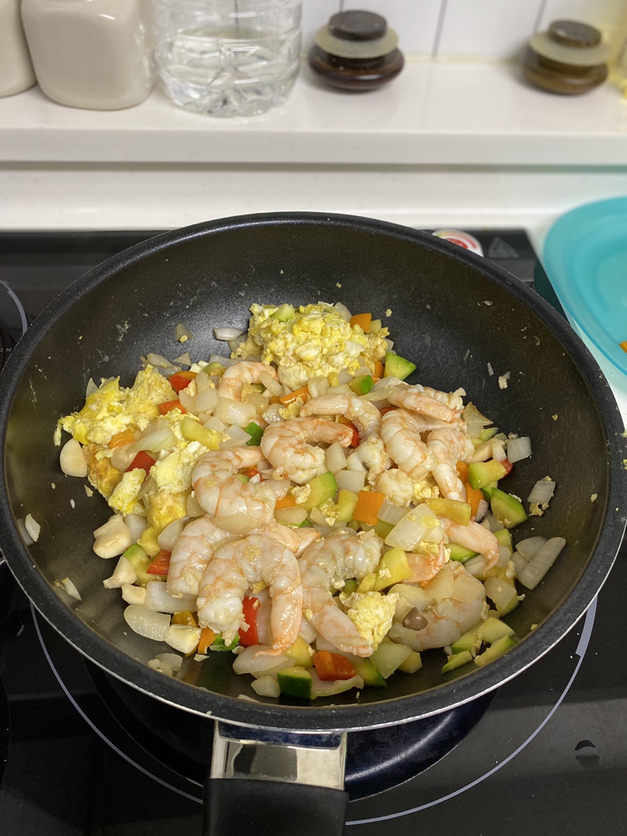 먼저 프라이팬에 식용유를 두른 후 소금을 뿌려가며 달걀을 볶아준다. 바닥이 눌어버리기 때문에 밥은 나중에 넣을수록 좋다. 어느 정도 익기 시작하면 간장을 바닥에 뿌려 태워주면서 새우와 채소들을 모두 넣어준 후 계속 볶아준다.