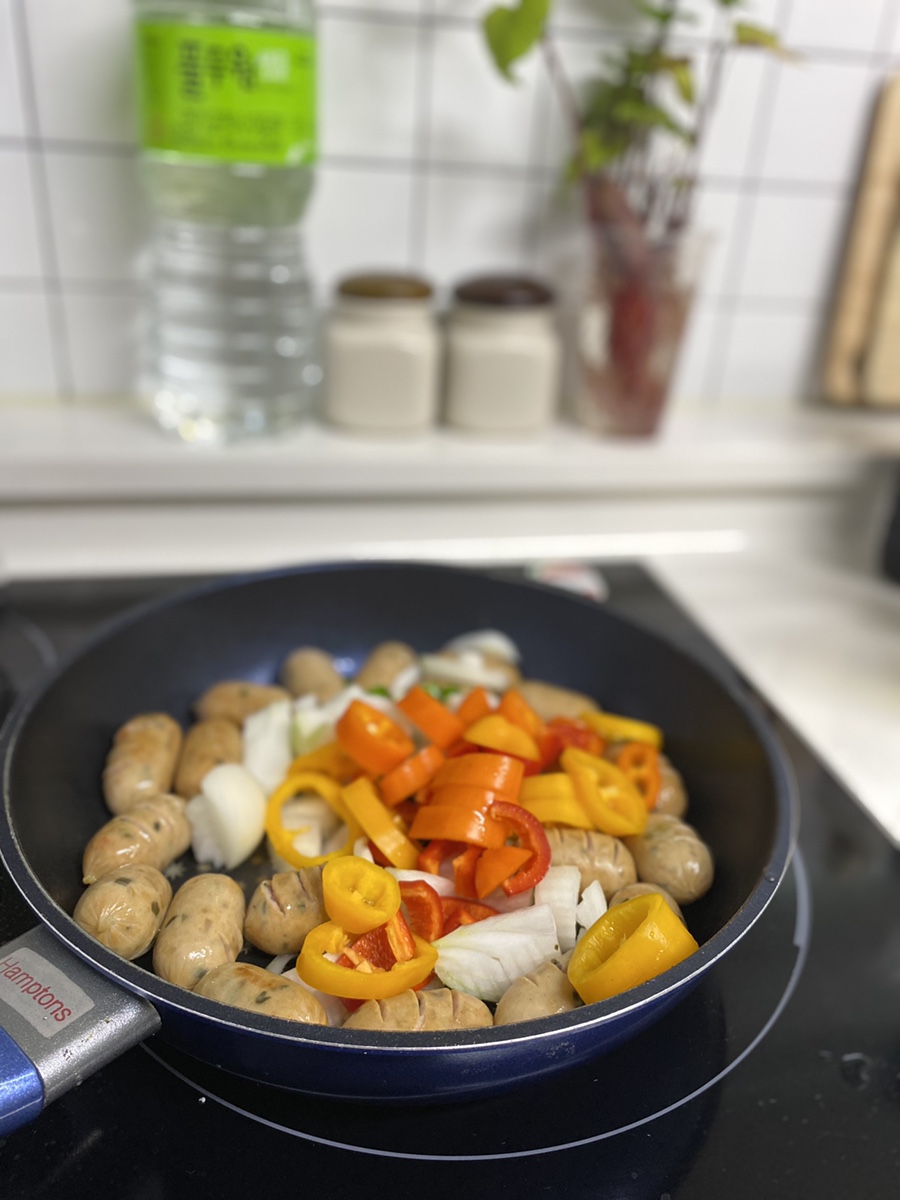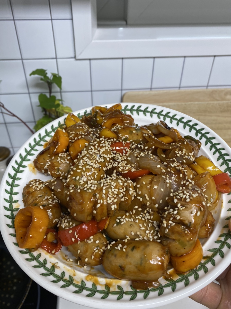 소세지와 채소를 서로 볶아준 상태에서 소세지가 잘 익었으면 만들어 둔 소스를 부어준다. 채소는 양파 2개 정도와 파프리카 색깔별로 넣어주면 좋다. 꼬마 파프리카 색깔별로 섞여있는 제품을 마트에서 구입할 수 있다. 청양 고추도 1개 정도 넣어주면 매콤한 맛이 소세지랑 잘 어울릴 것 같다. 약불에 살살 섞어주면서 마무리를 해준다.