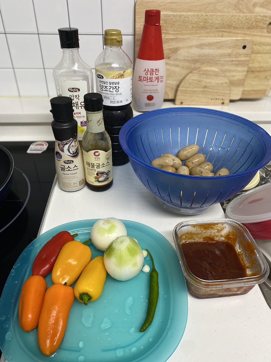 소스 만들기 : 고추장(매콤) 한 스푼에 토마토 케찹(새콤)을 한 스푼 섞은 후 해물굴소스와 간장을 섞어준다. 설탕과 올리고당을 한 숟갈씩 넣어서 매콤한 소스를 달달하게 만들어준다.
