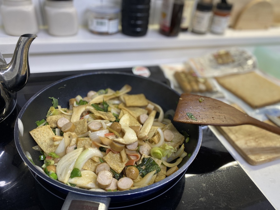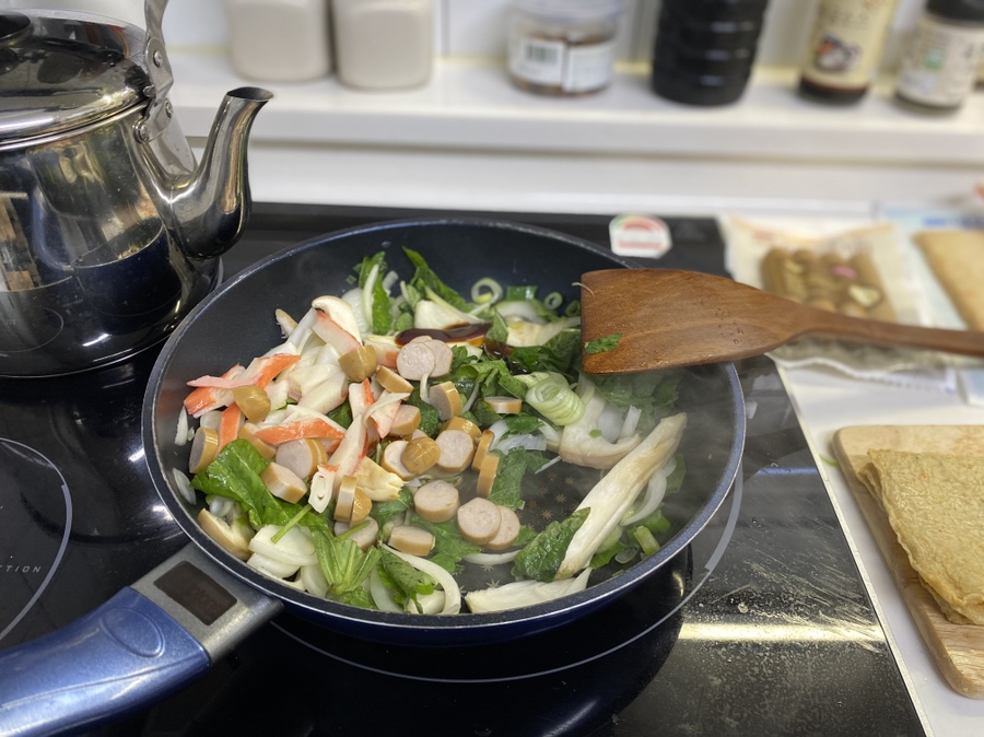 소세지와 게맛살을 먼저 넣어서 볶아준 후 어묵을 함께 넣어주면서 볶아줍니다. 어묵은 금방 익고 너무 익으면 흐물해지기때문에 마지막에 넣어줍니다. 이때 간장 2큰술, 굴소스 1큰술, 소금, 후추를 약간씩 뿌려주면서 간을 봅니다.